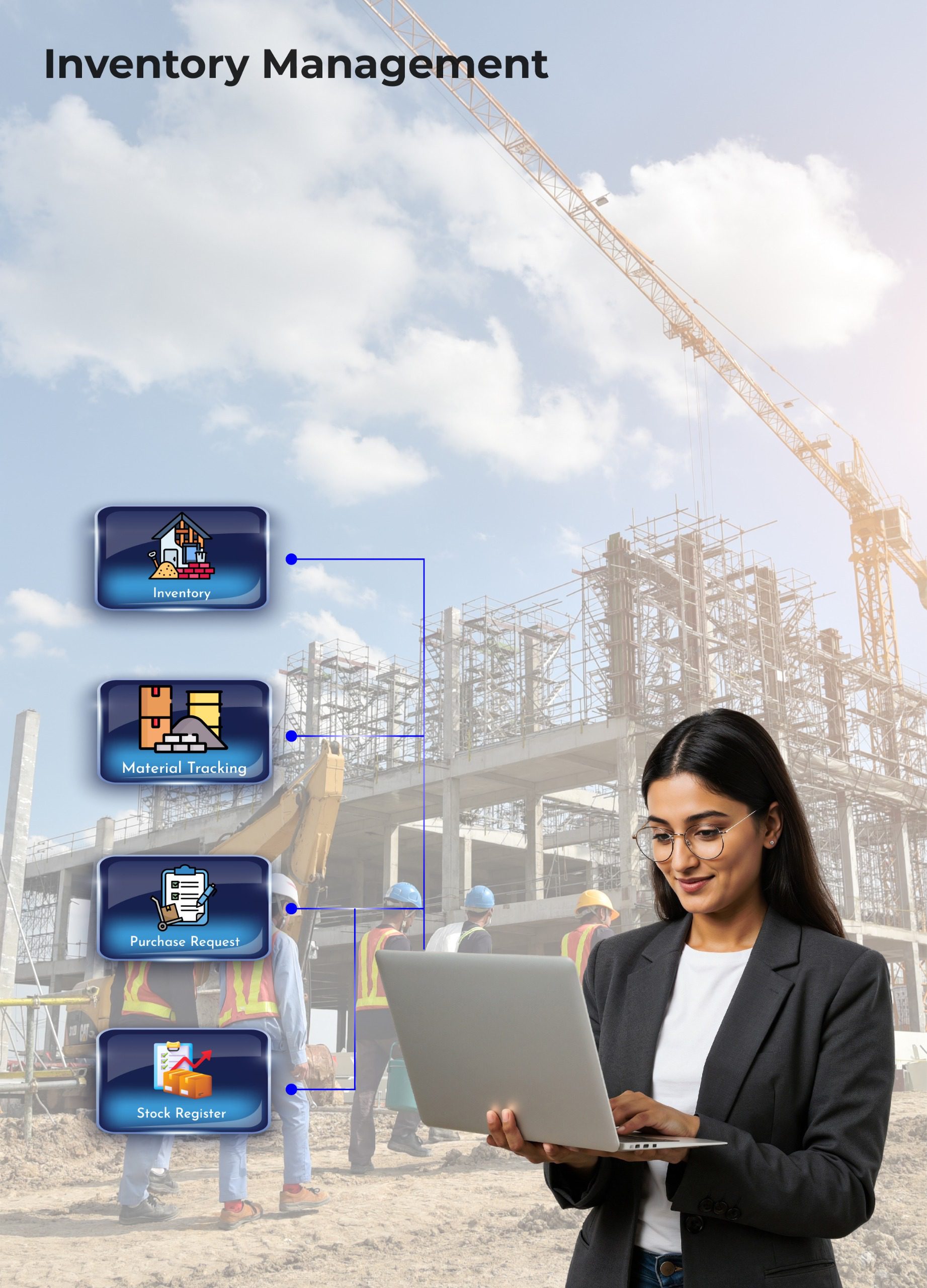 Users can track stock levels, material movements, transfers between sites, supplier details, and purchase activities.Real-time inventory visibility helps prevent overstocking or shortages, improves procurement planning, and ensures efficient utilization of materials across projects.